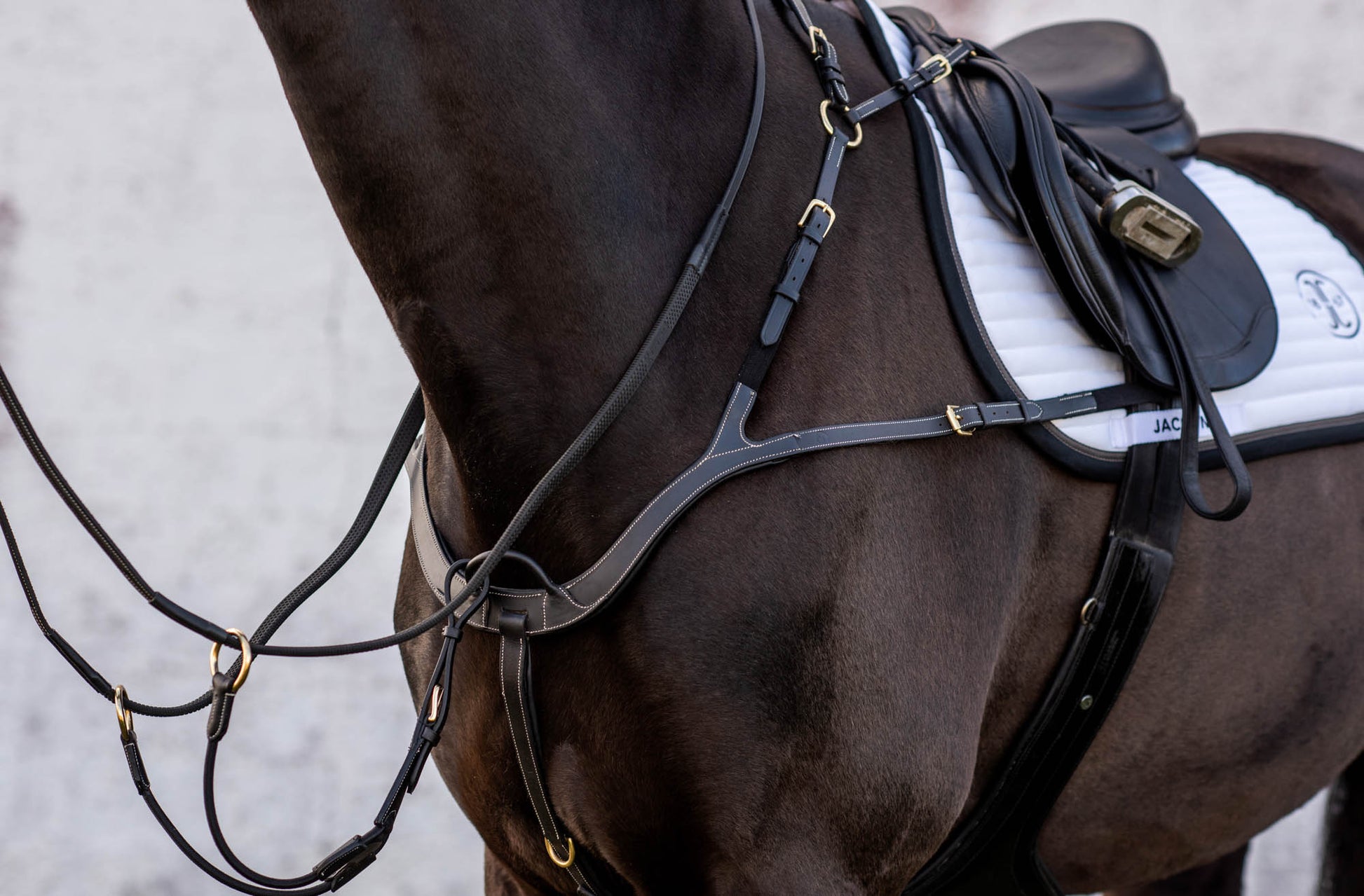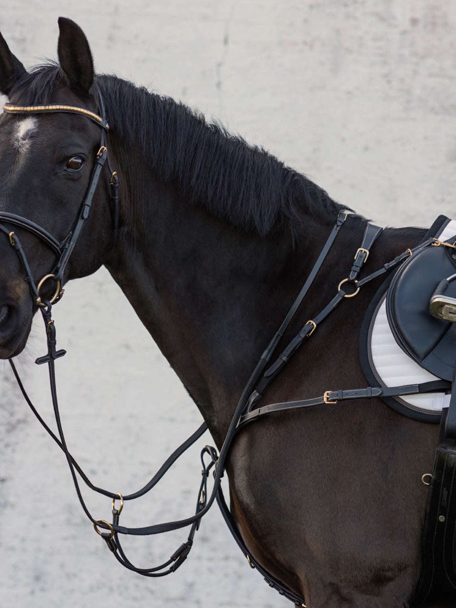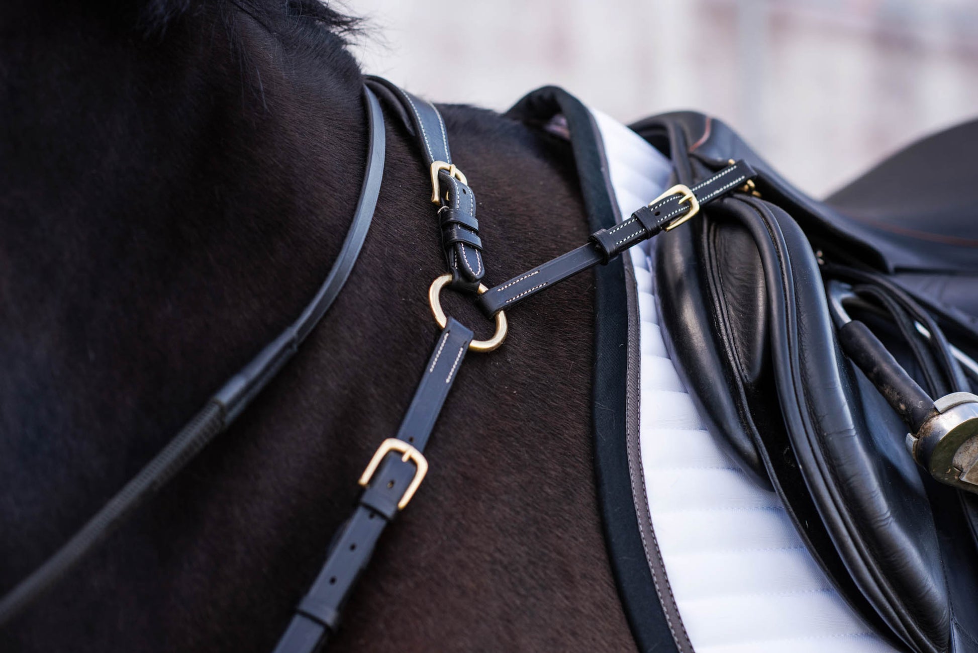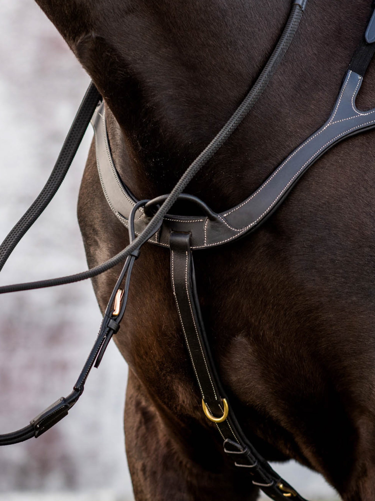 Mjukt fodrad förbygel med elastisk martingal som är både avtagbar och ställbar. Fem-punktsfäste, sidofästen med resår, pistolhake under magen och på sadelfästen. Ljusa dekorsömmar och spännen i mässing.