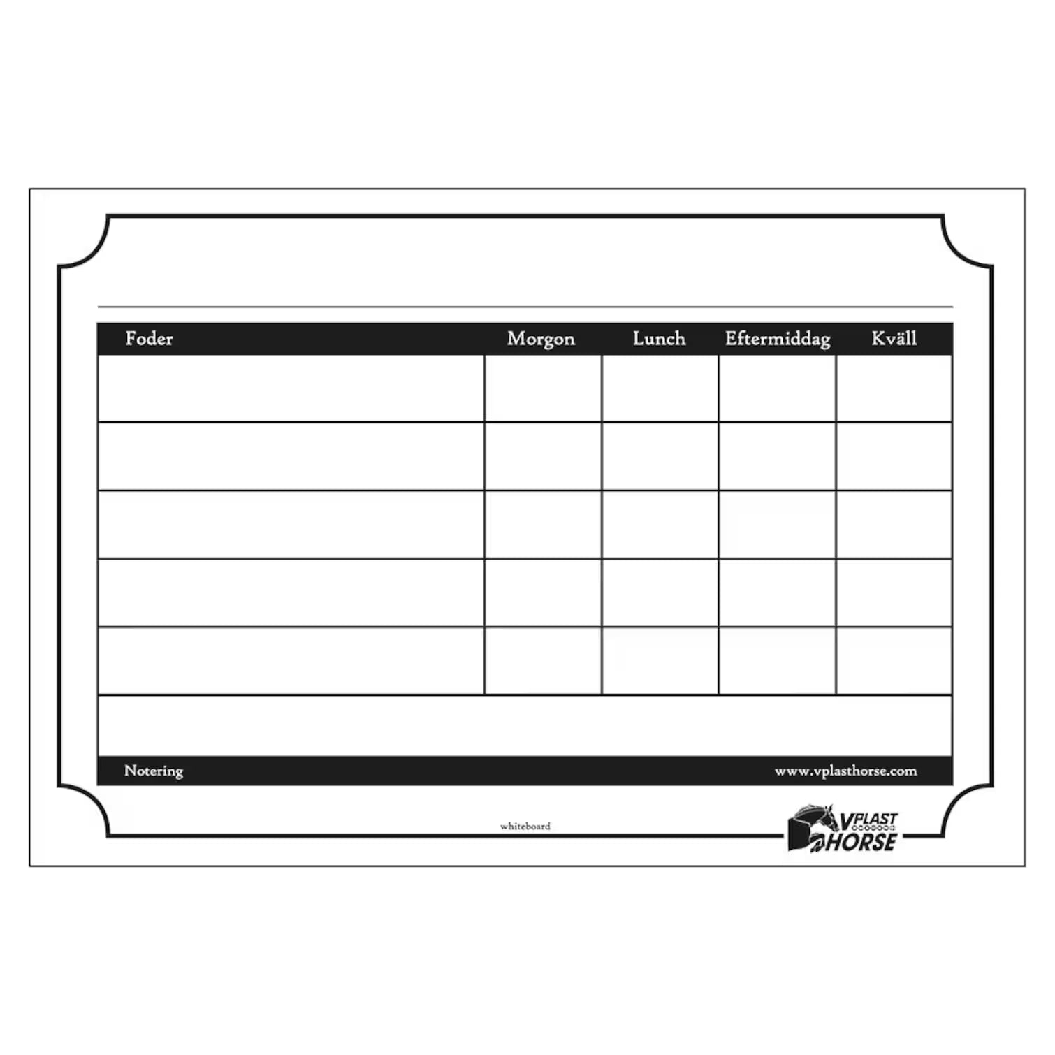 Fodertavla av plast som gör att kan du enkelt läsa av varje hästs foderschema. Använd whiteboardpenna.