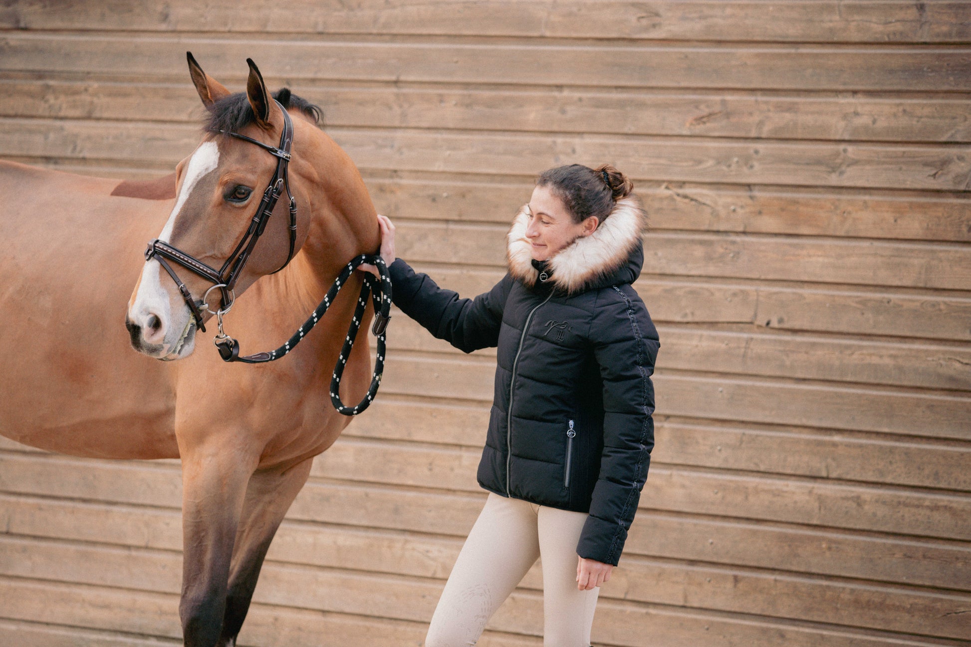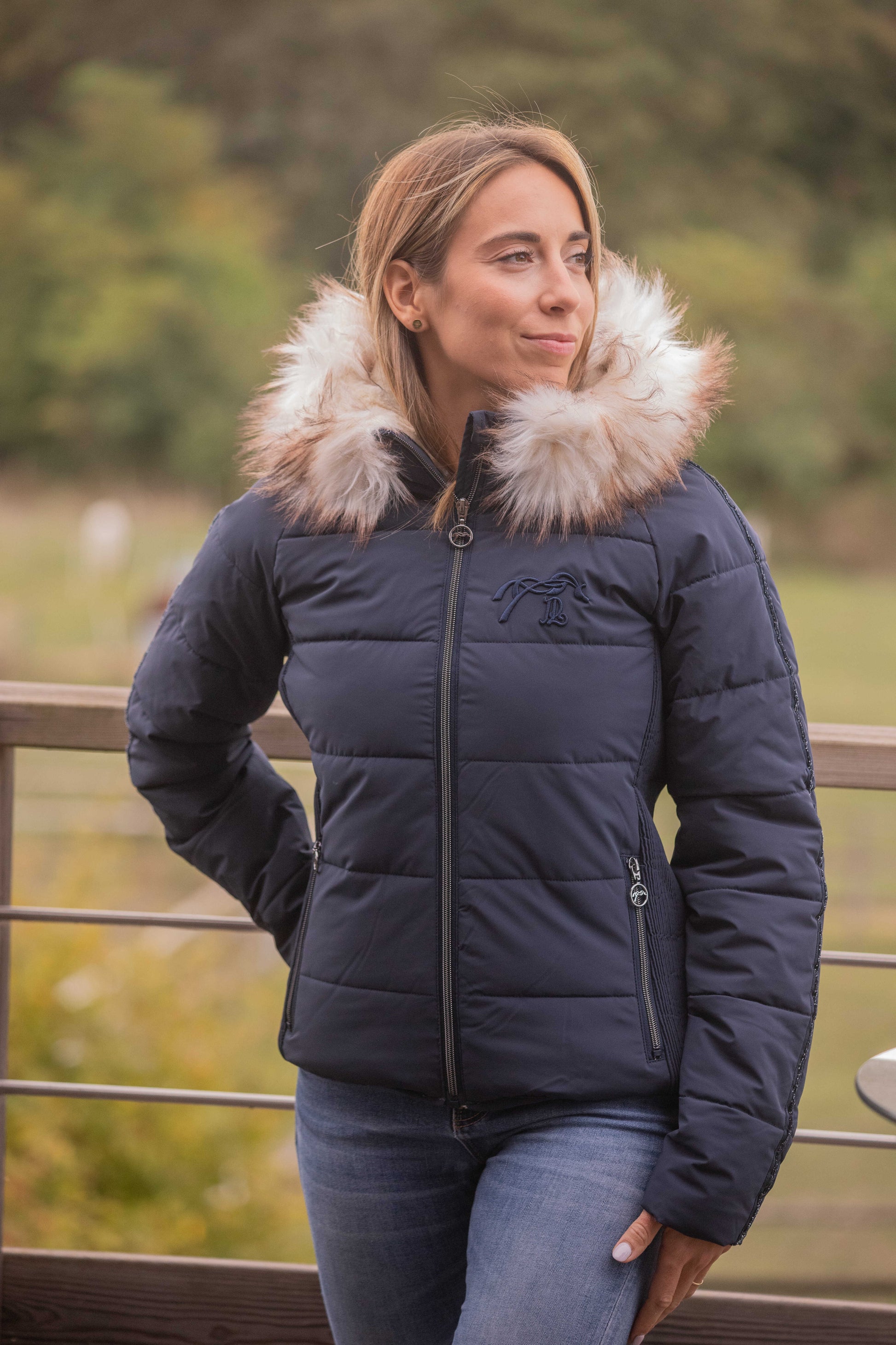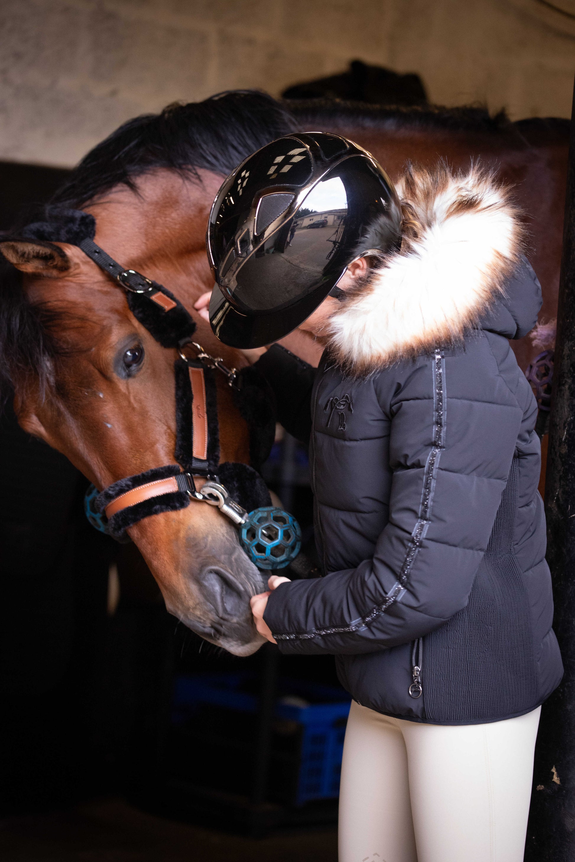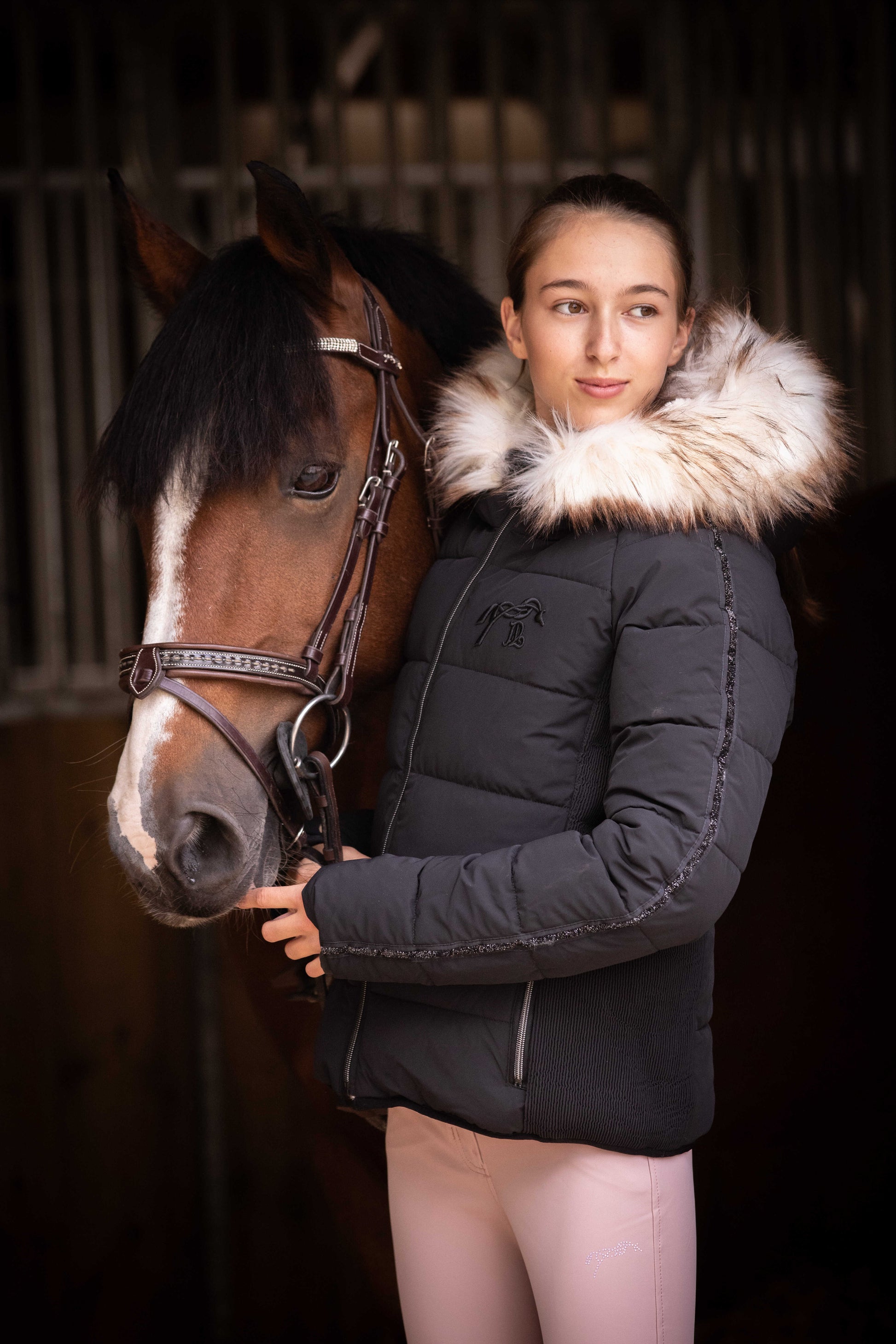 Svart dunjacka med tjock och horisontell quiltning och mycket bekvämt stretchtyg. På varje sida ger ribbade stretchband komfort till detta vinterplagg. Invändigt ger en vacker ultramjuk fleece bra värme för vintersäsongen i stallet. Ett glänsande och skimrande band löper längs armarna. Pénélope-logotypen är broderad i relief ton-i-ton på bröstet. Luvan är avtagbar och omgiven av en magnifik fuskpäls. Det finns en stor central dragkedja och två fickor med dragkedja på sidorna. Louxy-jackan är idealisk för ridning i kallt väder men passar också perfekt i stan.