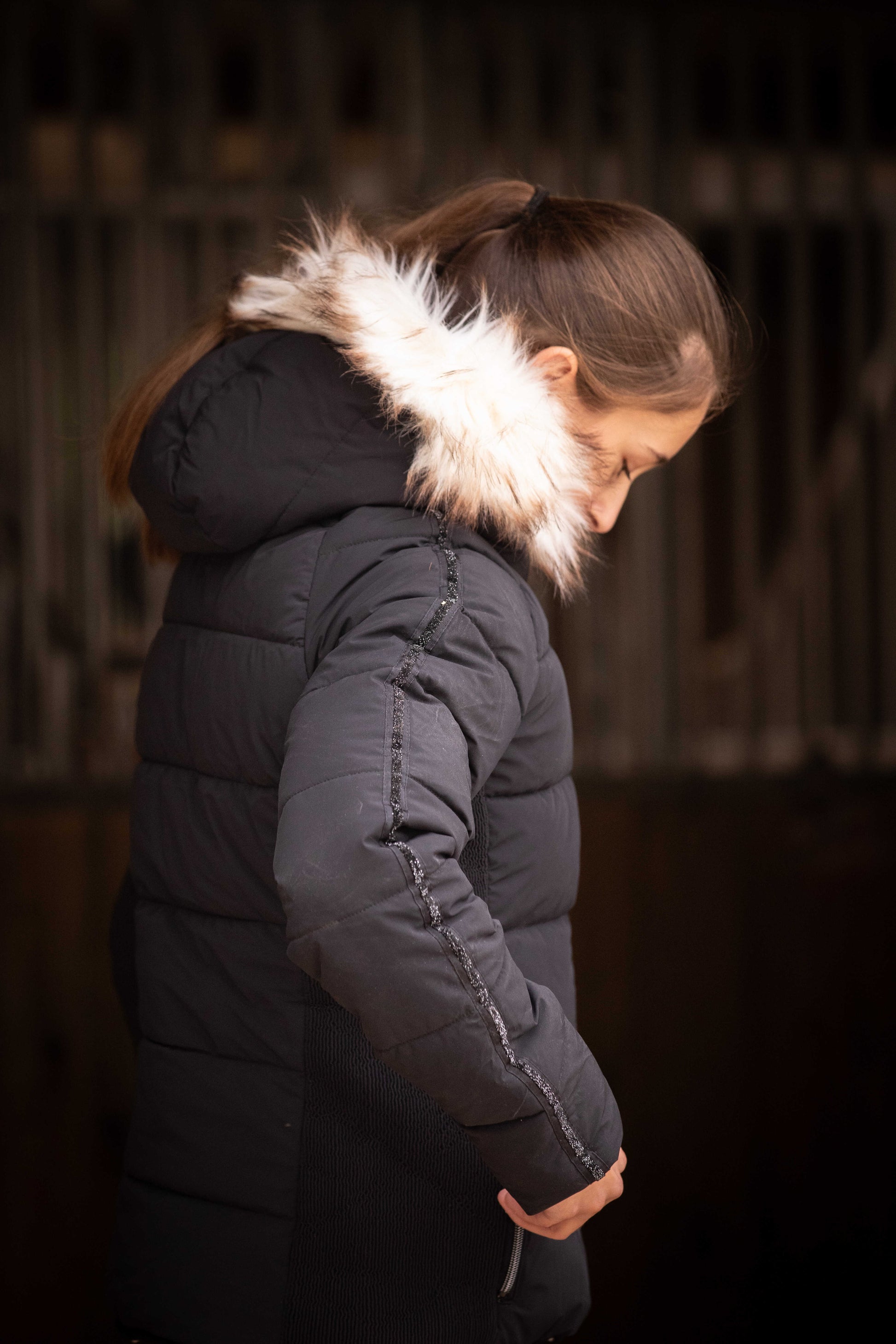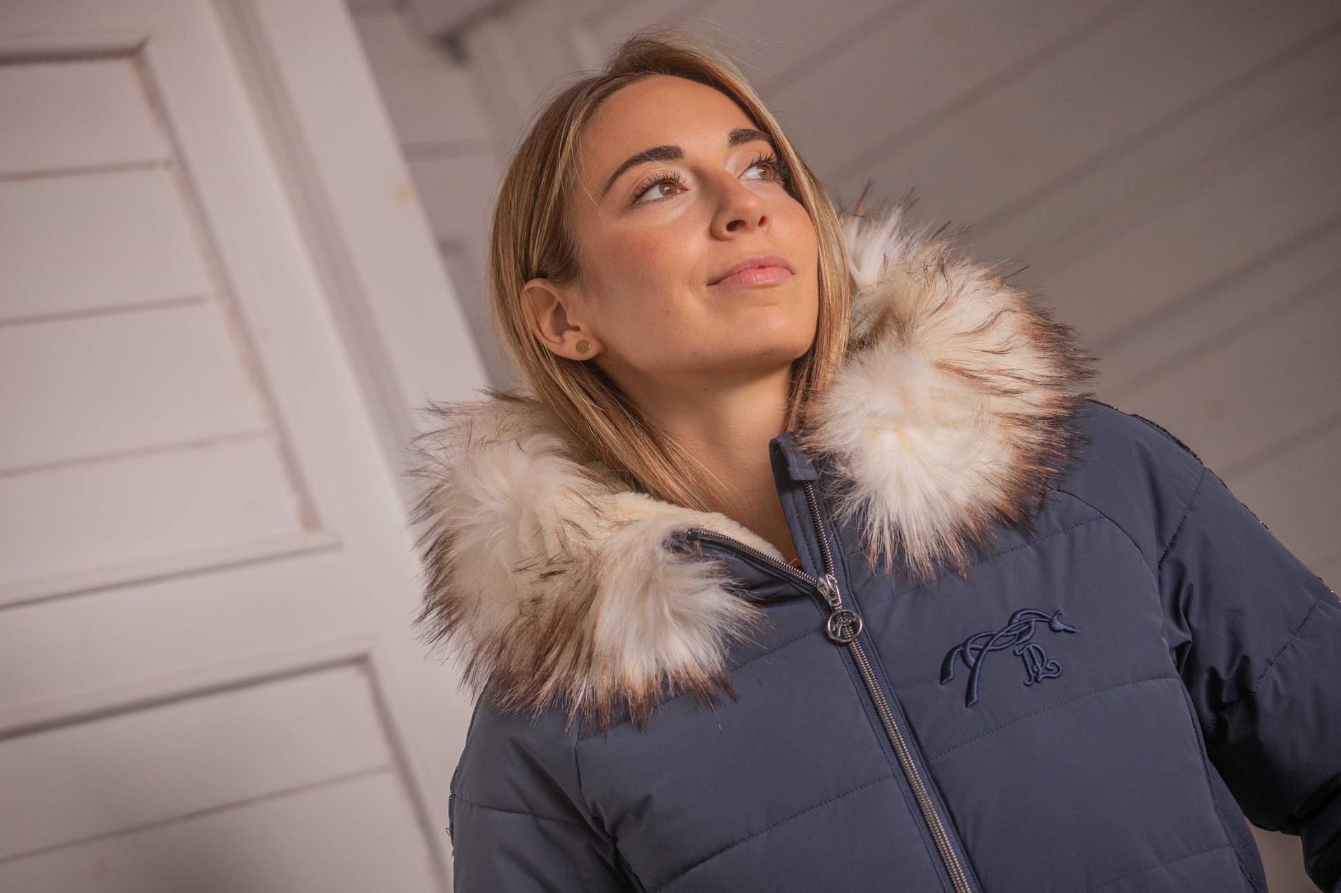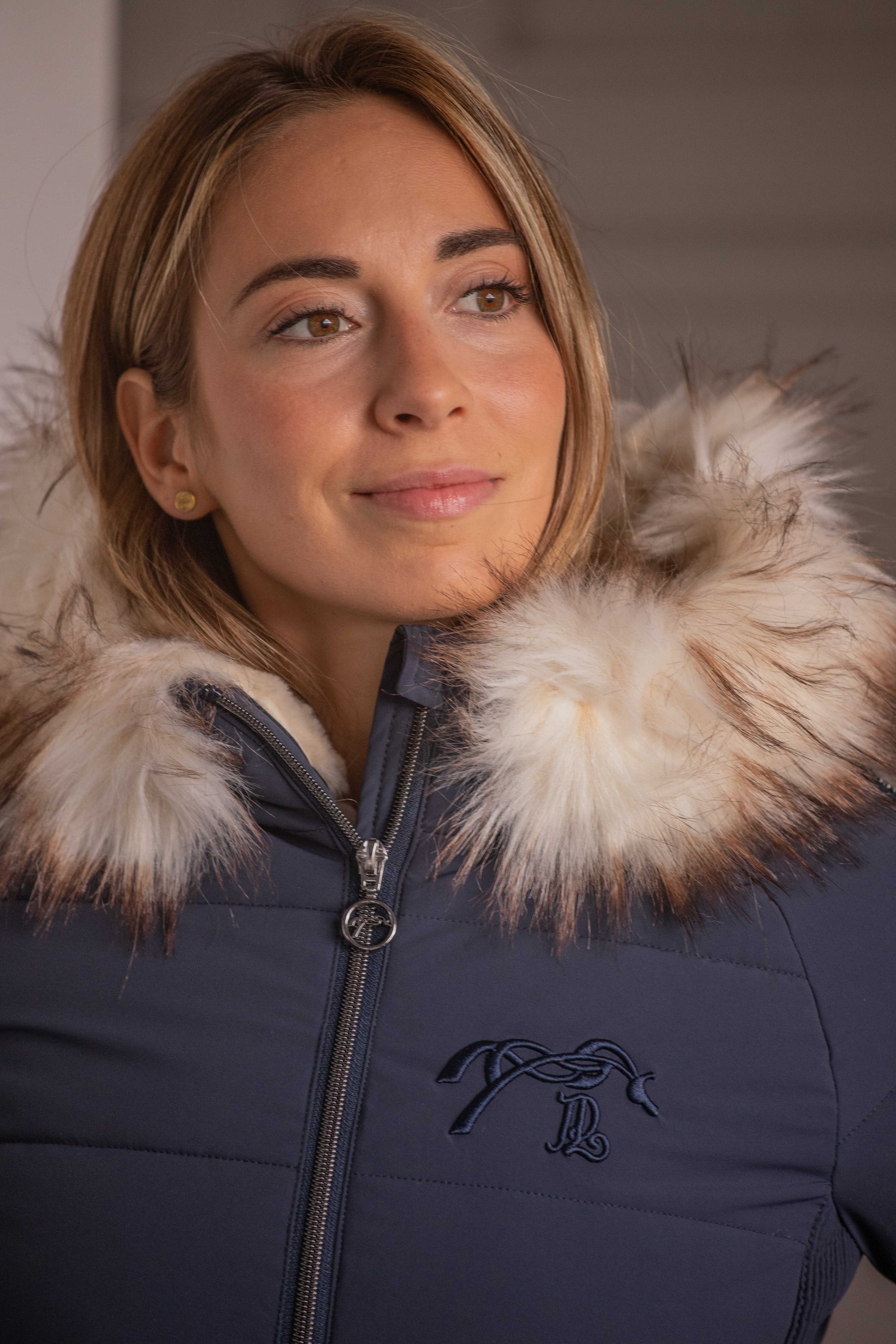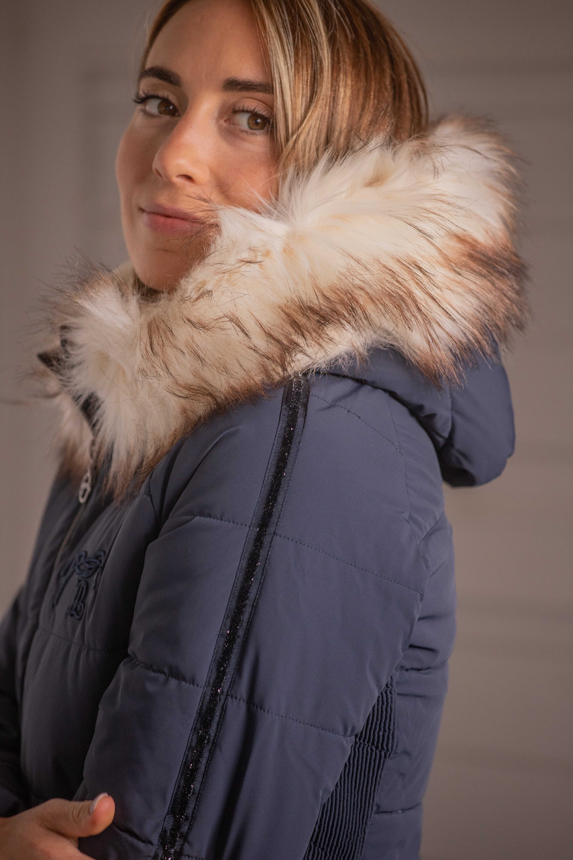 Svart dunjacka med tjock och horisontell quiltning och mycket bekvämt stretchtyg. På varje sida ger ribbade stretchband komfort till detta vinterplagg. Invändigt ger en vacker ultramjuk fleece bra värme för vintersäsongen i stallet. Ett glänsande och skimrande band löper längs armarna. Pénélope-logotypen är broderad i relief ton-i-ton på bröstet. Luvan är avtagbar och omgiven av en magnifik fuskpäls. Det finns en stor central dragkedja och två fickor med dragkedja på sidorna. Louxy-jackan är idealisk för ridning i kallt väder men passar också perfekt i stan.