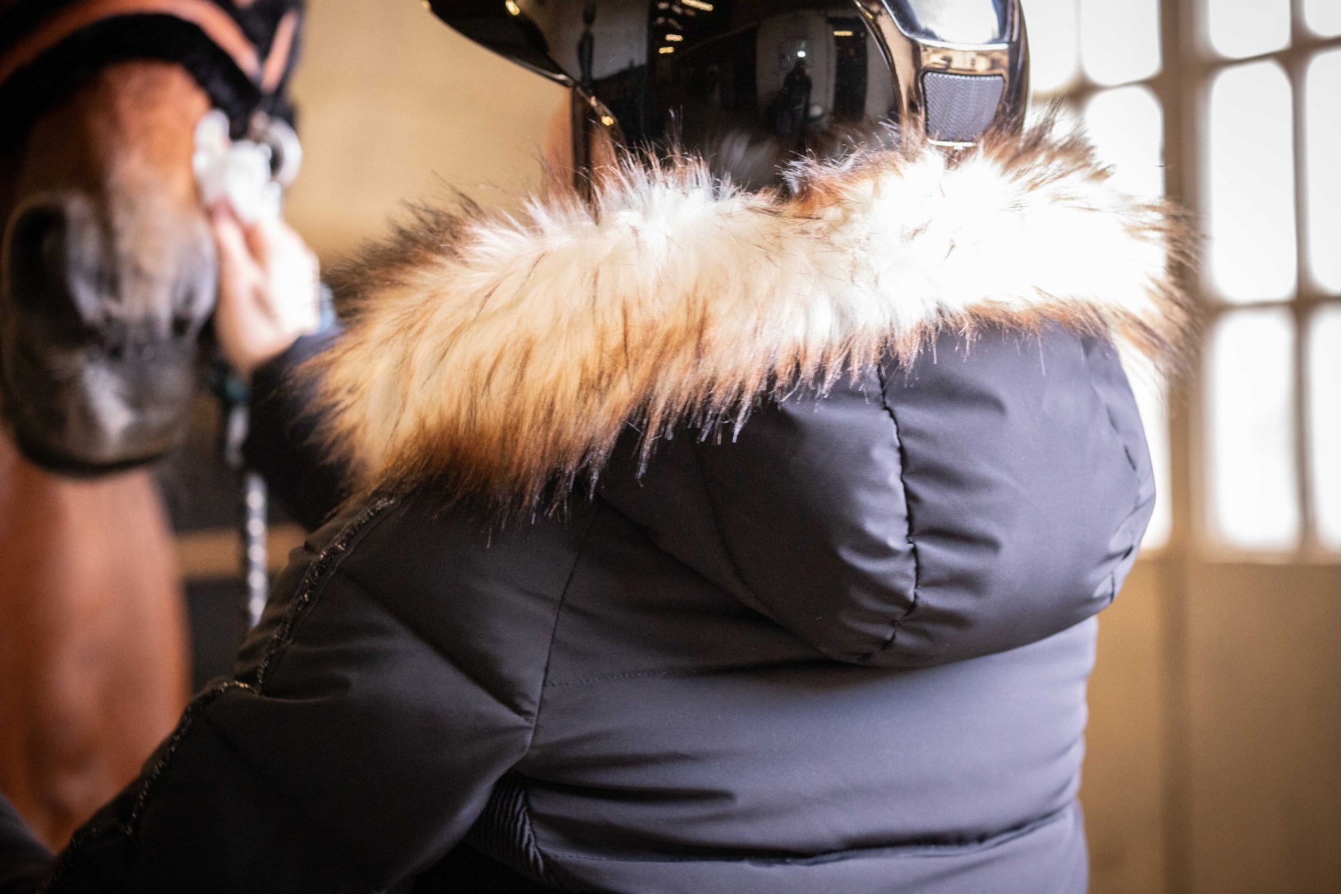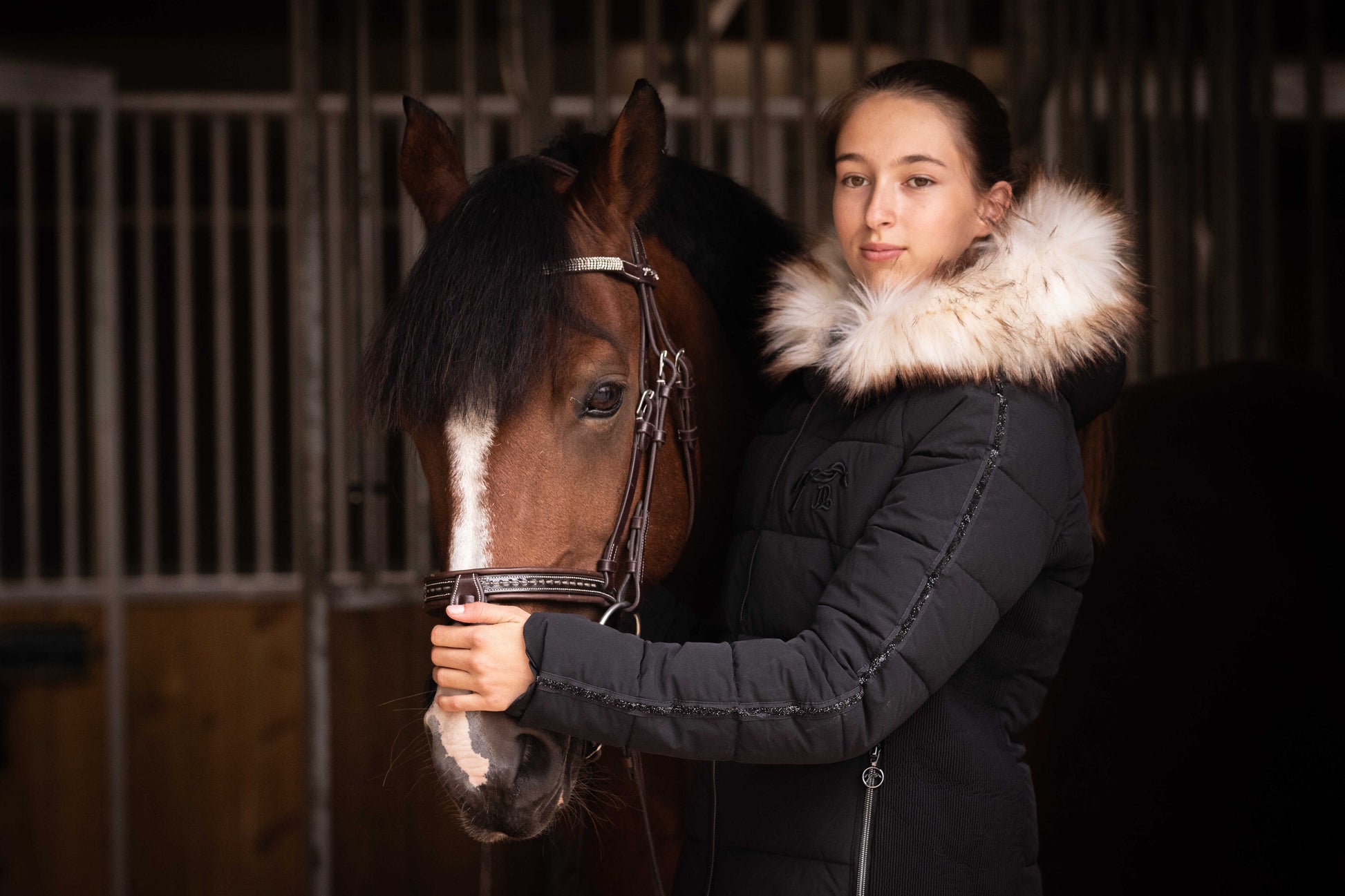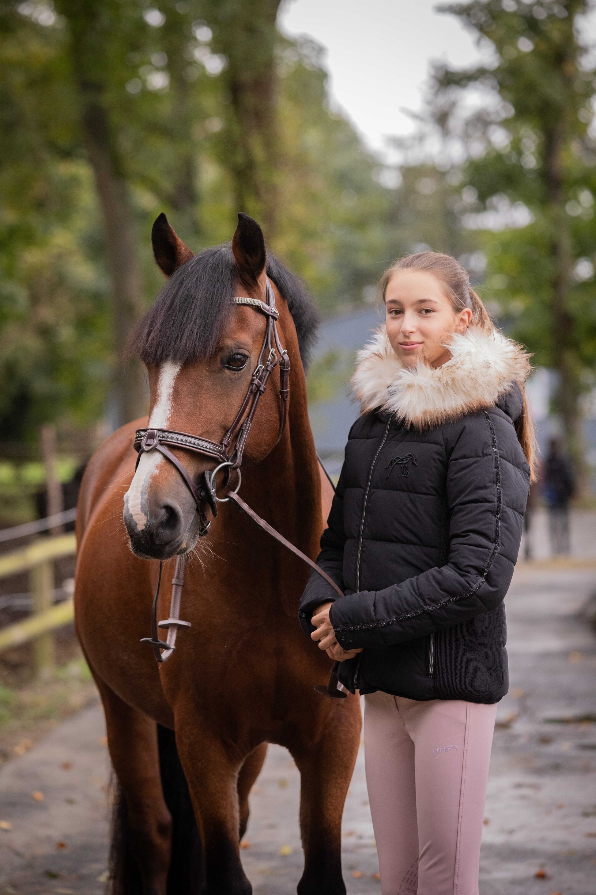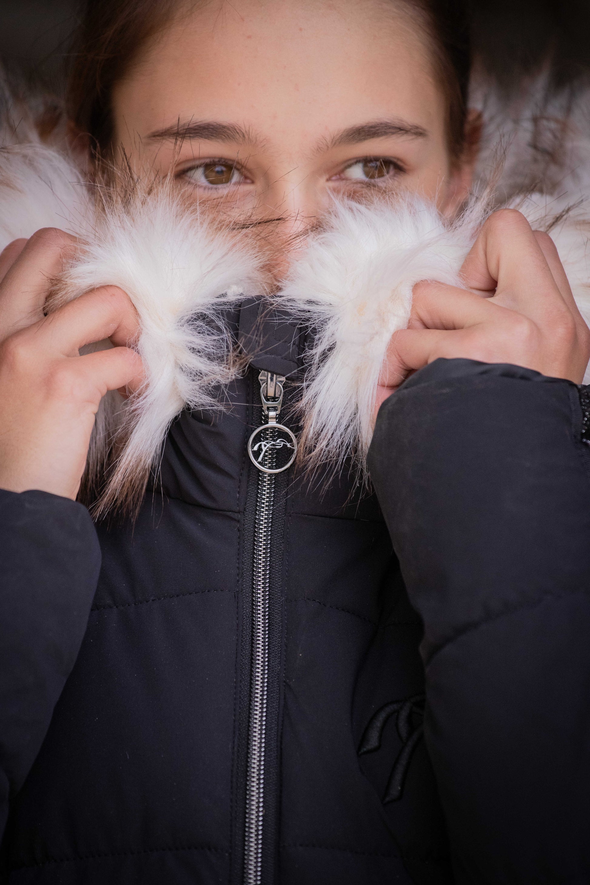 Svart dunjacka med tjock och horisontell quiltning och mycket bekvämt stretchtyg. På varje sida ger ribbade stretchband komfort till detta vinterplagg. Invändigt ger en vacker ultramjuk fleece bra värme för vintersäsongen i stallet. Ett glänsande och skimrande band löper längs armarna. Pénélope-logotypen är broderad i relief ton-i-ton på bröstet. Luvan är avtagbar och omgiven av en magnifik fuskpäls. Det finns en stor central dragkedja och två fickor med dragkedja på sidorna. Louxy-jackan är idealisk för ridning i kallt väder men passar också perfekt i stan.