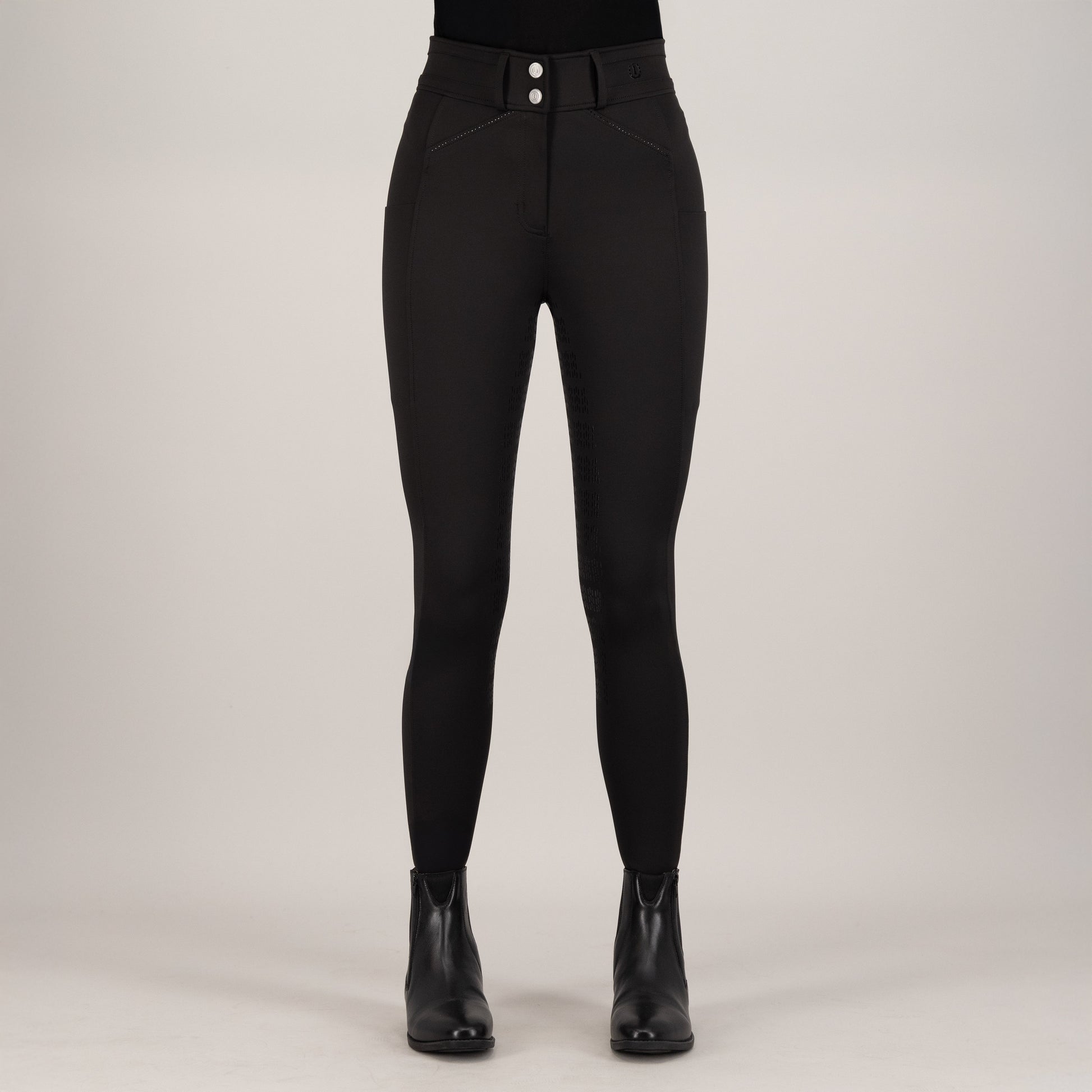 Med sin snyggt skräddarsydda midja som är lätt upphöjd baktill erbjuder dessa ridbyxor en smickrande passform med perfekt komfort. De gnistrande strassdetaljerna vid de eleganta fejkfickorna fram och locken bak ger en exklusiv look. De diskreta mobilfickorna på sidorna gör det enkelt att förvara telefonen och andra småsaker, medan det randiga FullGrip-sätet i silikon ger optimalt grepp och stabilitet i sadeln. En ridbyxa som kombinerar funktion och stil – året runt.